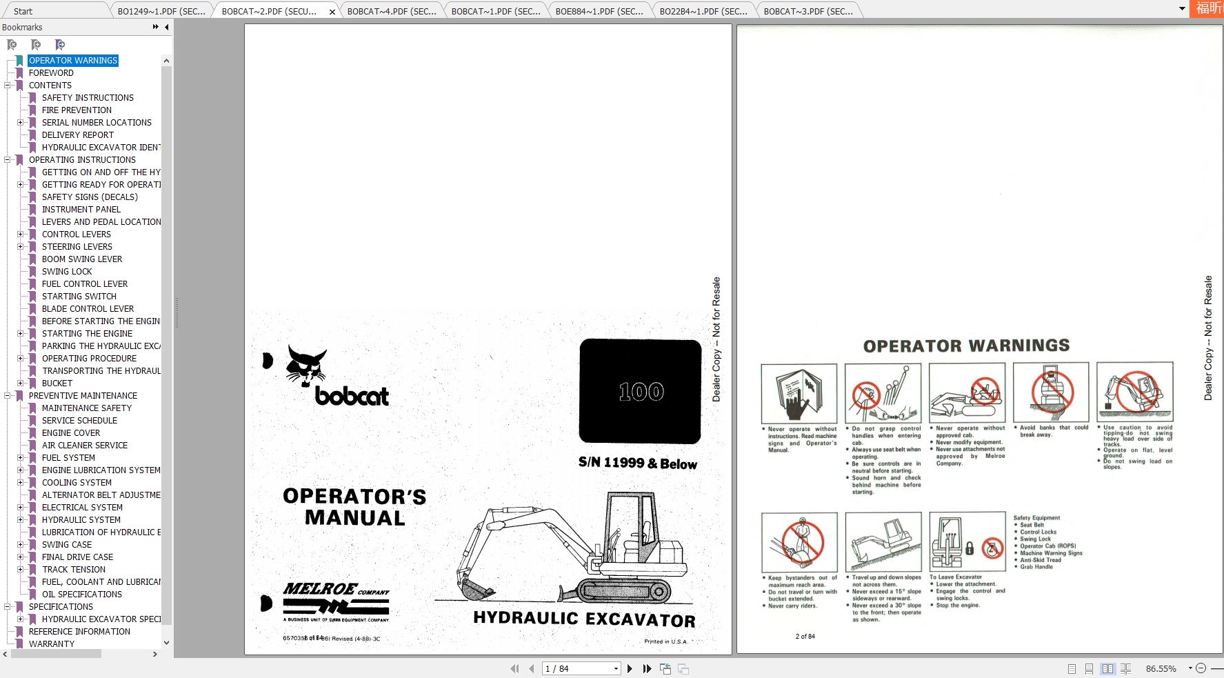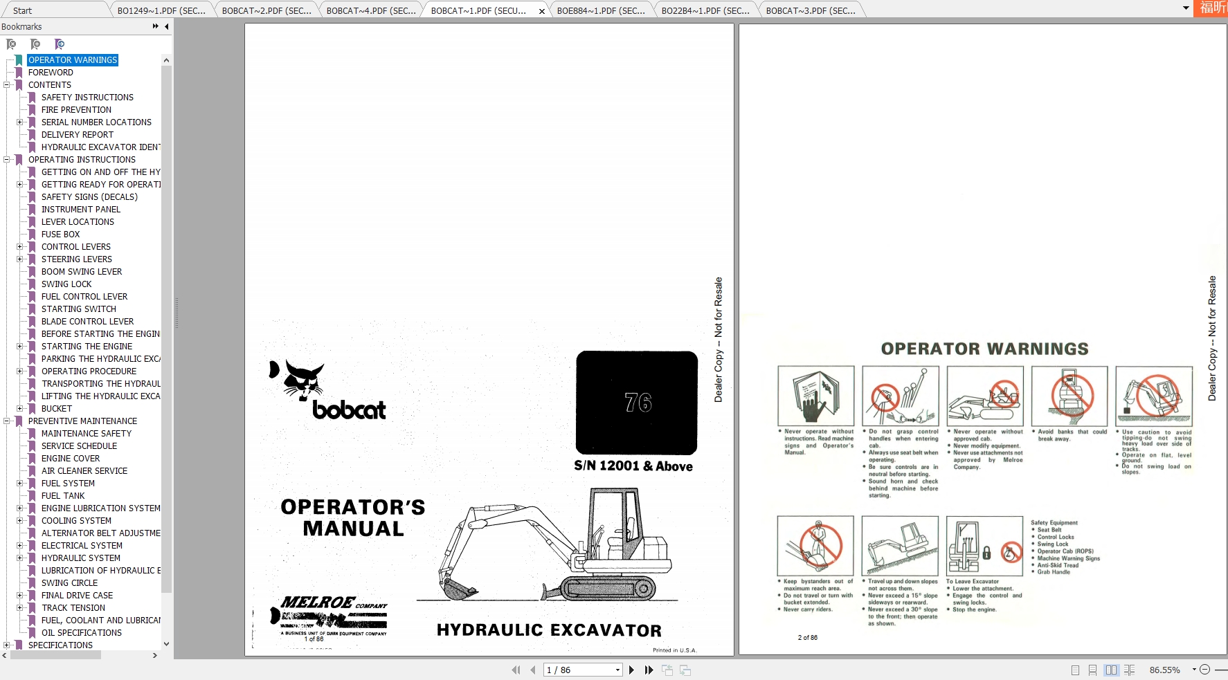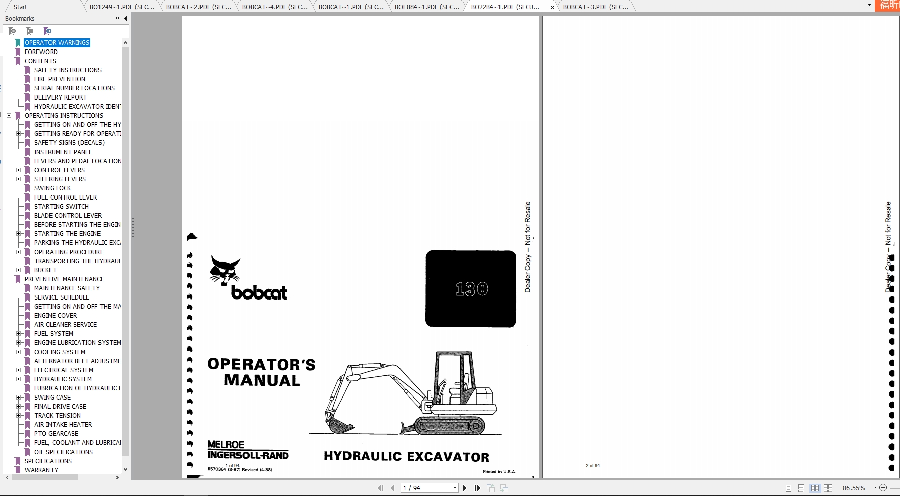 Bobcat Excavator 76 100 116 130 Operator’s Manuals