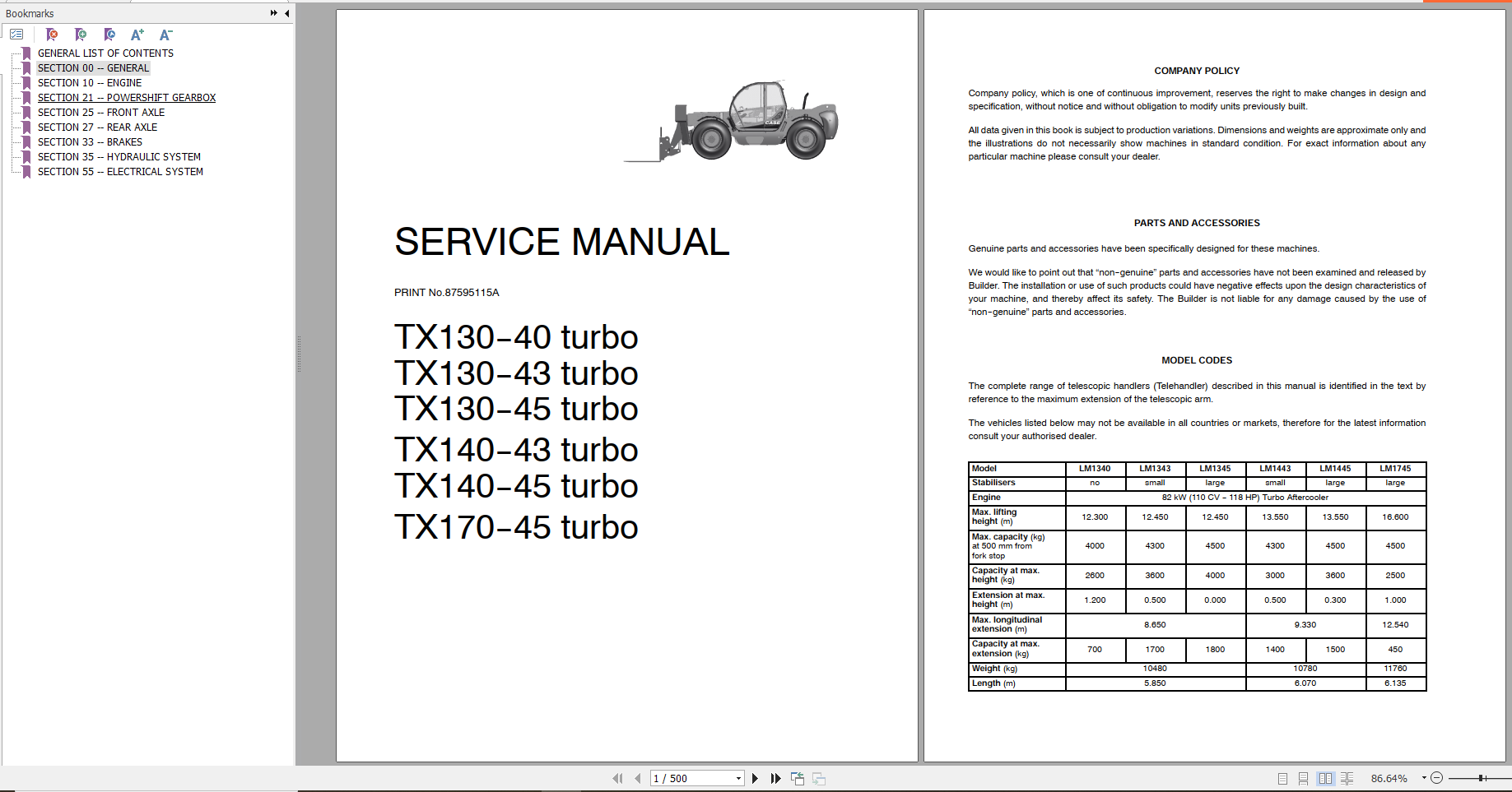 Model: Case Telehandlers TX130 45 TX140 45 TX170 45 TURBO