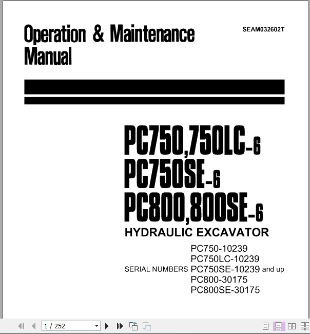Komatsu Hydraulic Excavator PC750_10239 PC800SE-6_30175 and up Operator manual SEAM032602T