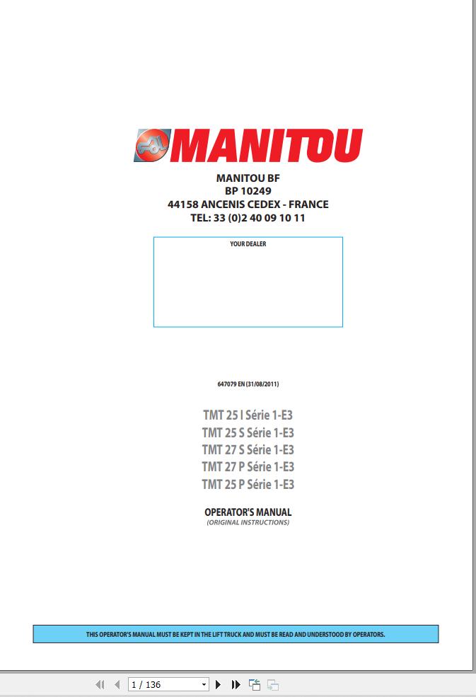 Manitou MLT 523 Turbo Evolution SC E3 Repair Manual 647042EN